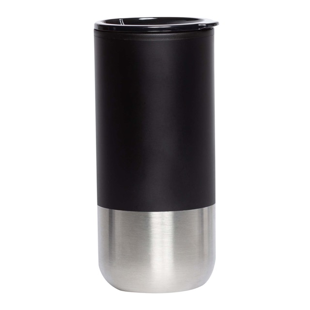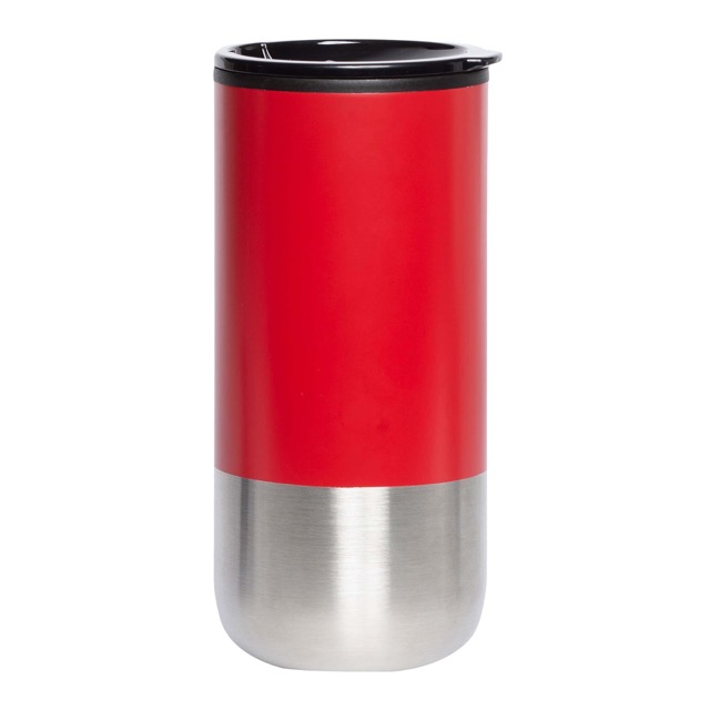 Termo de doble pared con interior de plástico y base exterior de acero inoxidable, cuenta con tapa de plástico y válvula de seguridad.