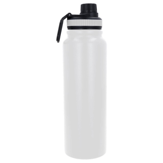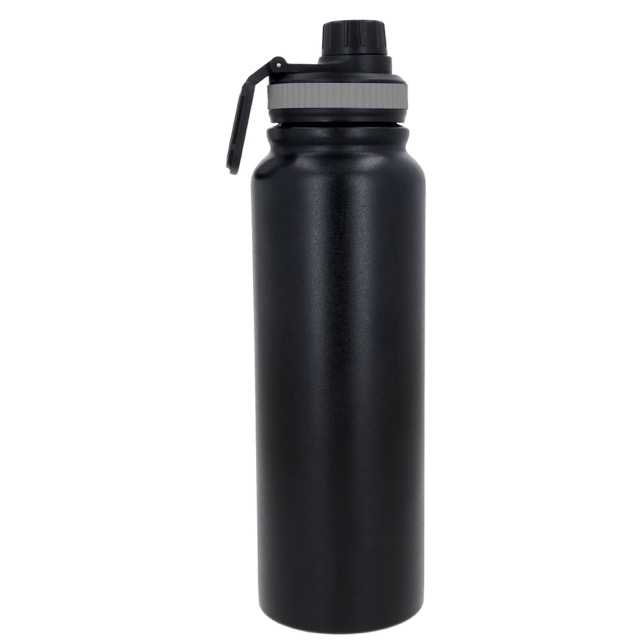 Termo de acero inoxidable de doble pared insulado al vacío con acabado rugoso. Cuenta con una tapa de rosca con asa para sujetarlo fácilmente.