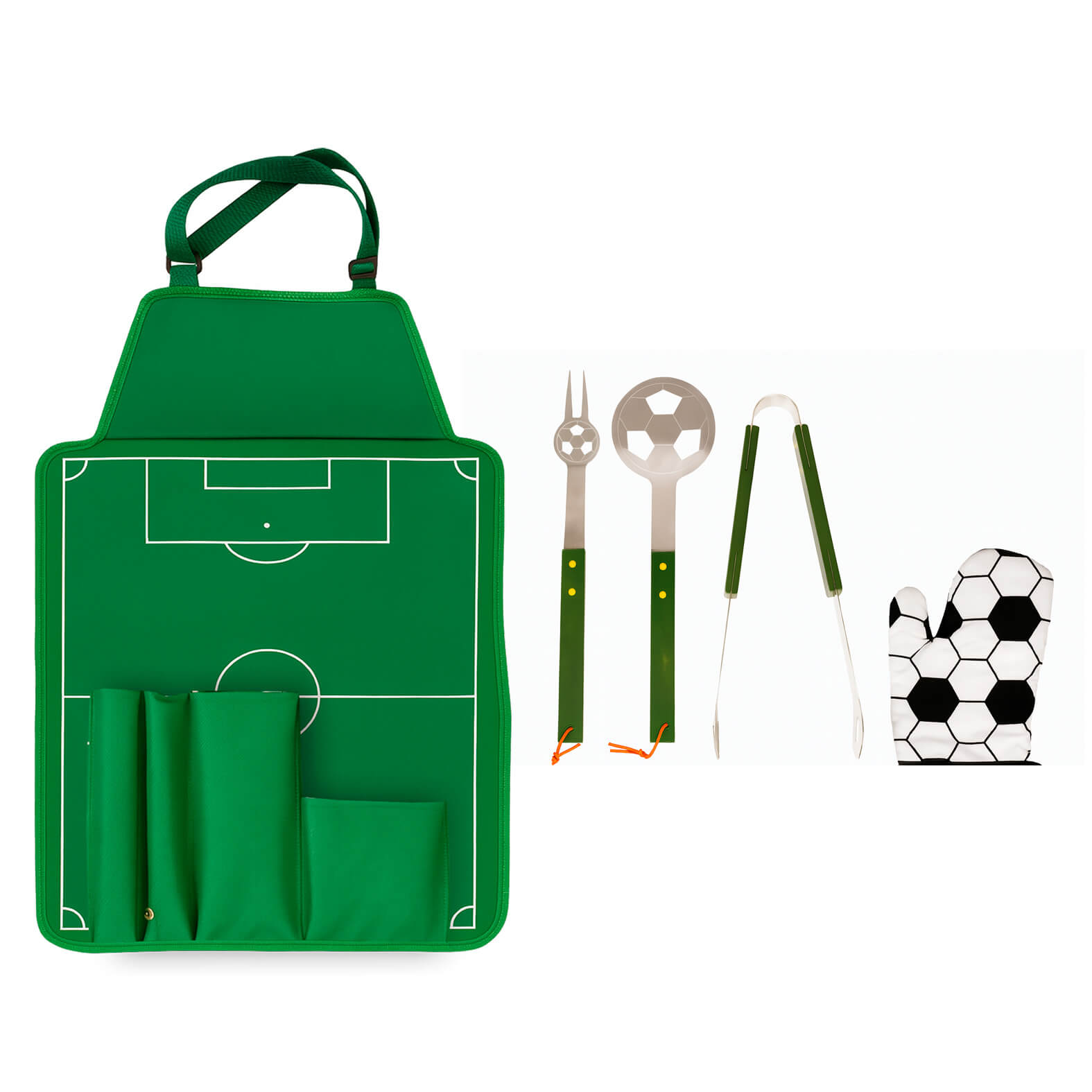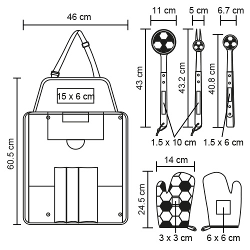 Set de BBQ en estuche con diseño de cancha de fútbol que también funciona como mandil. Incluye guante, pinzas, tenedor asador y volteador.