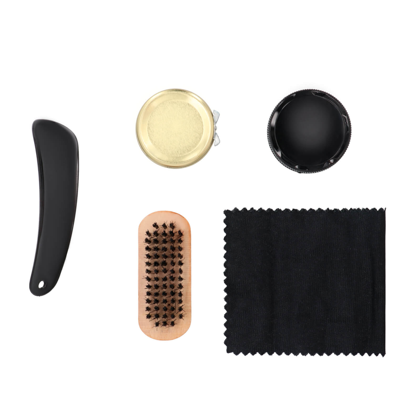Set de boleado para calzado con estuche de poliéster y correa ajustable que incluye: calzador, cepillo de madera, paño, lustrador con esponja y grasa en crema color negro.