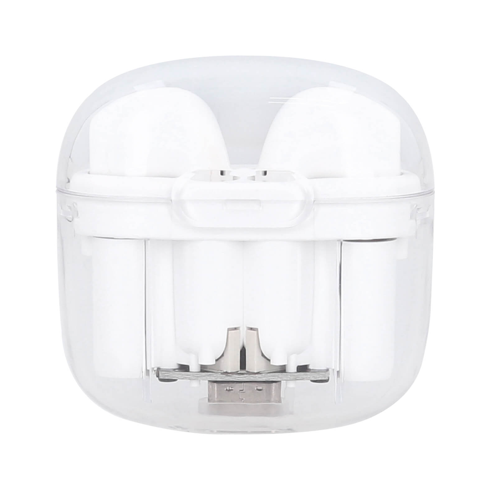 Audífonos inalámbricos con estuche transparente, batería recargable y mecanismo touch. Incluye cable de carga tipo C.