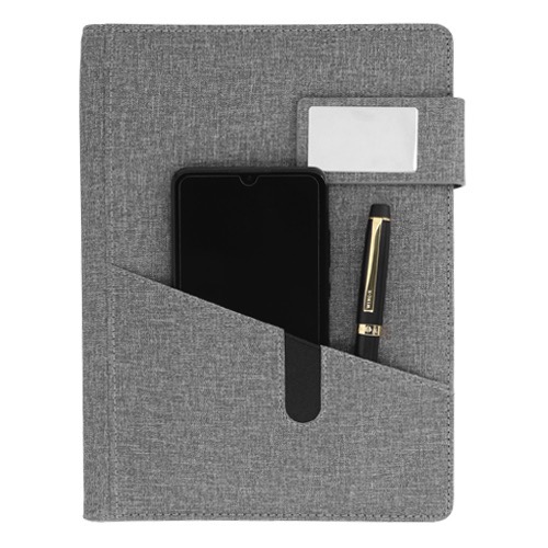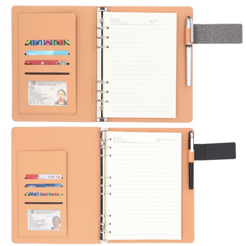 Carpeta de poliuretano con broche magnético y placa metálica, con porta papeles en la pasta, en el interior cuenta con porta tarjetas, 98 hojas rayadas y arillo metálico.