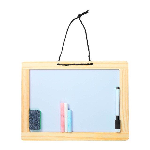 Pizarrón de doble cara con acabado de madera que incluye mini borrador, plumón y gis.