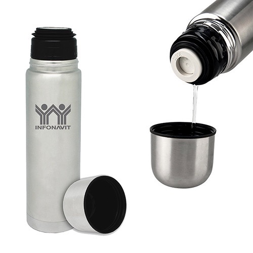 Termo con doble pared de acero inoxidable con sistema push y tapa que se utiliza como vaso.