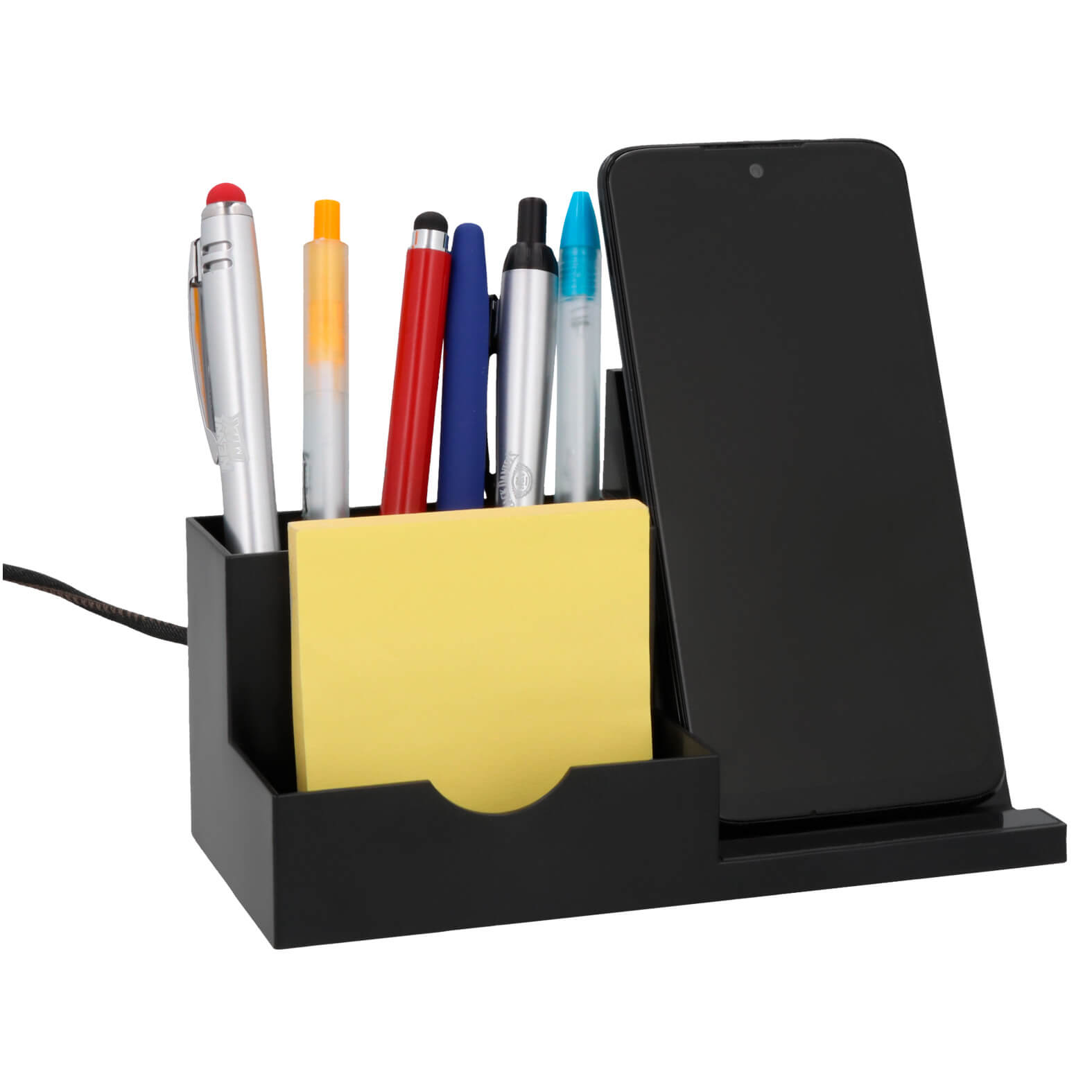 Multiorganizador para escritorio con cargador wireless para smartphones. Compatible con smartphones con tecnología Qi. Potencia de salida de máximo 15W. Incluye cable de carga.