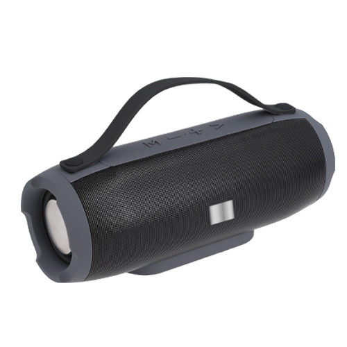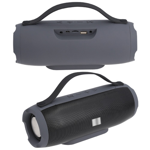 Bocina portátil bluetooth en acabado rubber con placa metálica, correa de silicón, radio FM, función de manos libres, control de volumen, botón de encendido y apagado, entrada micro USB, entrada micro SD, entrada USB y entrada AUX. Batería recargable con duración de 2-3 horas.
