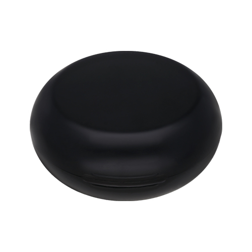 Audífonos bluetooth con estuche de plástico circular para carga y mecanismo touch. Incluye una pantalla de visualización de porcentaje de carga y cable.